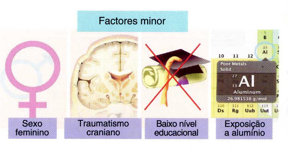 Factor minor - sexo feminino, traumatismo craniano, baixo nível educacional, exposição a alumínio (Al);