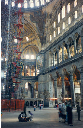 A Basílica de Santa Sofia, Hagia Sophia (Grego: Άγια Σοφία, Hagia Sophia, significando "Sagrada Sabedoria"; escrito Ayasofya em Turco) foi a catedral de Constantinopla (actual Istambul, Turquia). A primeira grande igreja no local foi construída por Constantius, o filho do Constantino o Grande, mas foi destruída durante o Revolta de Nika de 532. O edifício foi reconstruído em sua forma actual em 532 - 537 sob a supervisão pessoal do imperador Justiniano I. É um exemplo principal de arquitectura bizantina. De grande importância artística, seu interior foi decorado com mosaicos e colunas e esculturas de mármore. |